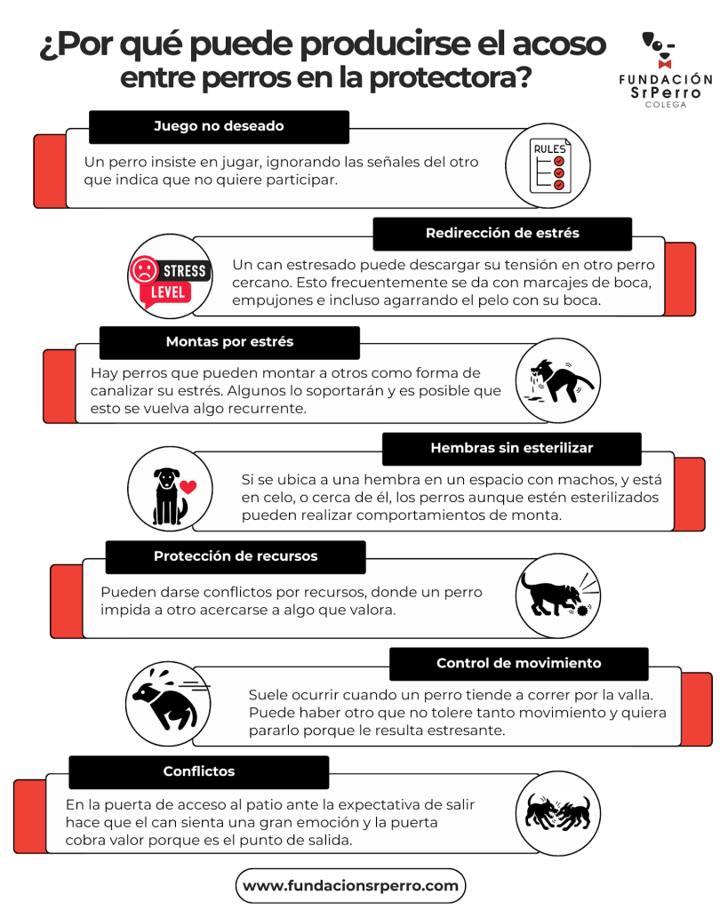 El acoso o bullying ocurre cuando uno o más perros ignoran el bienestar de otro, no respetan sus señales pidiendo espacio o no le permiten disfrutar de ciertos recursos como sombras o el agua.